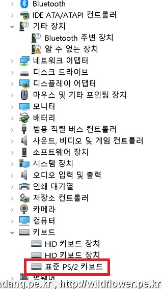 4. 노트북 재부팅 후 윈도우키 + X 를 눌러 [장치 관리자]를 실행합니다. 아래와 같이 키보드의 [표준 PS/2 키보드]를 사용 안하게 해야 합니다. 글씨 앞 키보드 그림에 노란 삼각형에 ! 표시가 보이실 겁니다. 이렇게 표시가 되셨으면 된 겁니다. 내장 키보드는 PS/2 방식으로 연결되는 데, 해당 포트를 강제로 사용 안하게 설정하는 원리입니다.