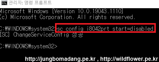 3. sc config i8042prt start=disabled 입력 후 엔터 하면 [[SC] ChangeServiceConfig 성공] 메시지 보이시면 성공!