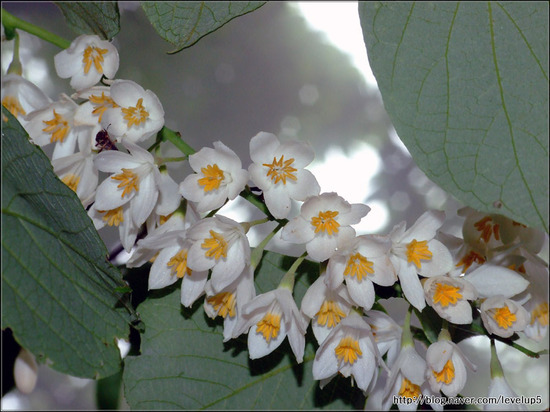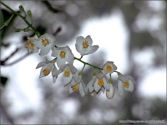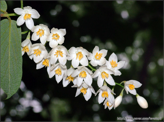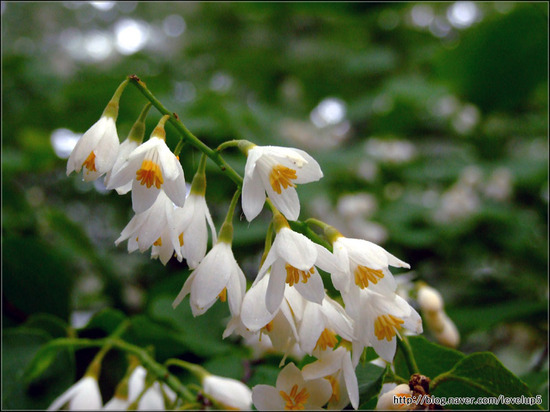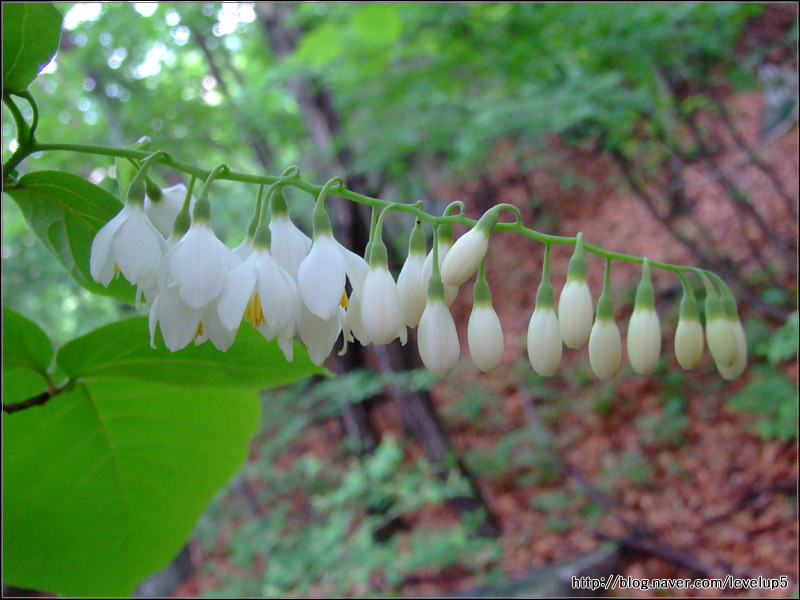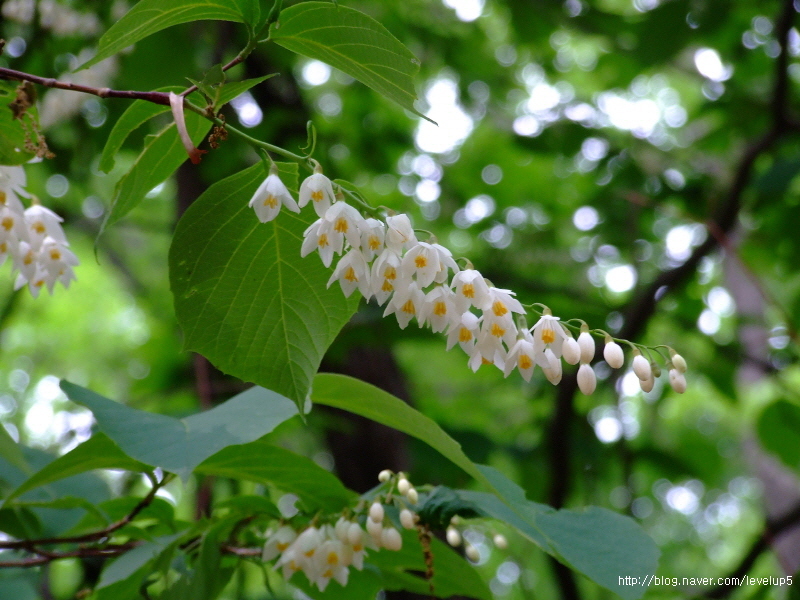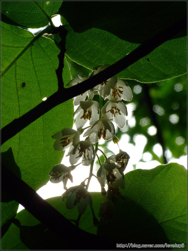 설명 : 쪽동백나무는 잎이 좀더 둥글고 꽃은 가지 끝에 20송이 내외로 피고, 때죽나무는 가지 중간 중간에 3~4송이씩 핀다.