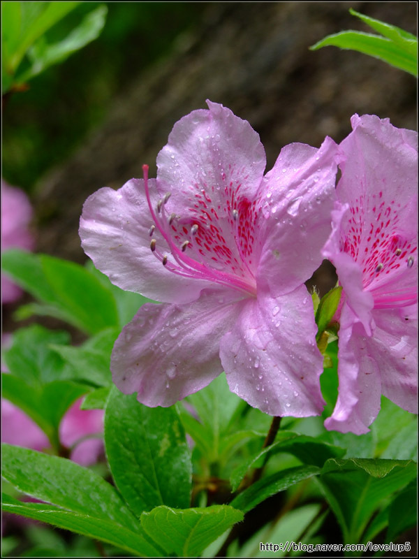 설명 : 일반 철쭉은 꽃잎이 옅은 분홍색에 점이 있고, 잎이 둥글하며, 산철쭉은 진한 분홍색에 잎이 뾰족하다