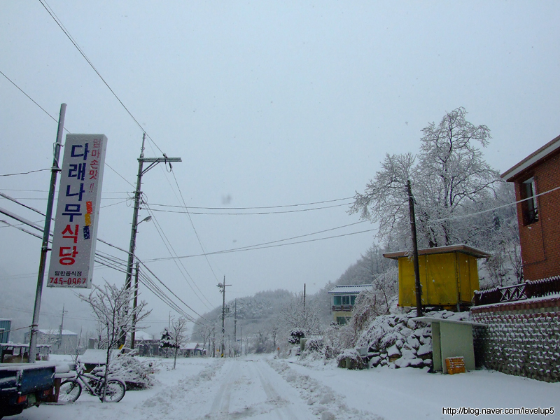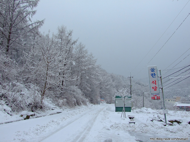 많은 눈이 내린 상황에서 다행히 도로는 어느정도 제설이 되었지만, 주차장으로 향하는 내리막길은 제설이 안되어, 뒤풀이할 식당에 차를 대놓고 산행을 시작했다.