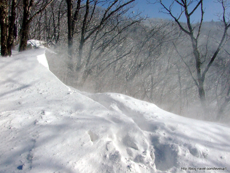 산행 중간 강풍에 눈보라가 날리고 있다.