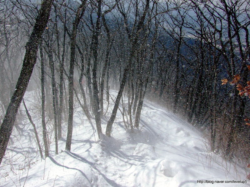 산행 중간 강풍에 눈보라가 날리고 있다.