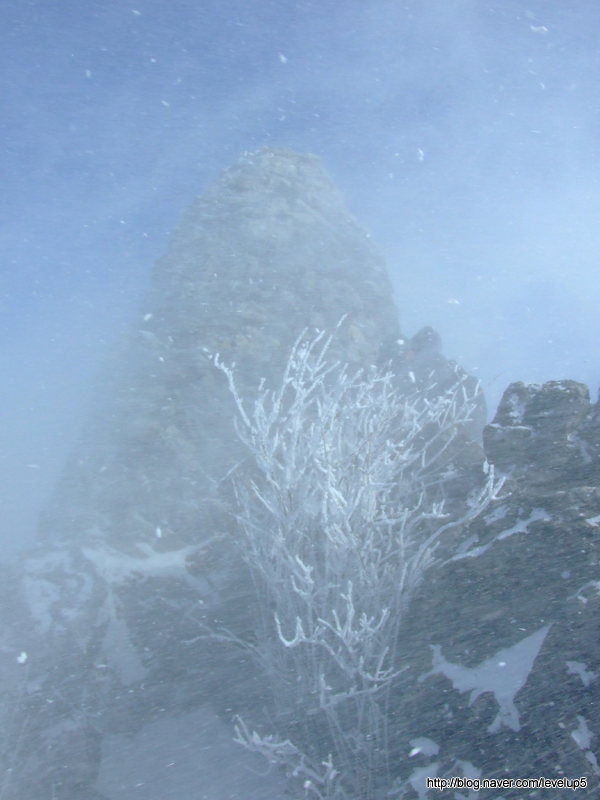 정상에 도착하니 순간적으로 불어오는 바람과 날리는 눈으로 앞이 잘 보이지 않았다.
