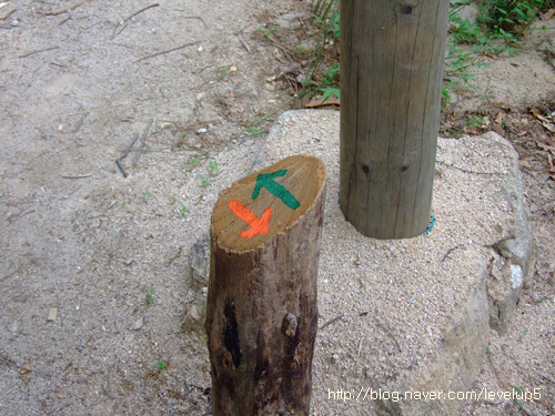 사선으로 베인 표시목 - 둘레길을 가면서 가장 기준이 되는(리본은 누가 훔쳐가도 모르지만, 이 통나무는 가져가지 못한다) 이 표시목이 있다면 그 곳은 둘레길 구간으로 보면 된다. 화살표가 있는 표시목도 있고, 주황색은 정방향 녹색은 역방향을 의미한다.또한 가끔 구간 표시를 뜯어간(?) 훼손된 것도 있으니 똑같이 참고하면 된다.