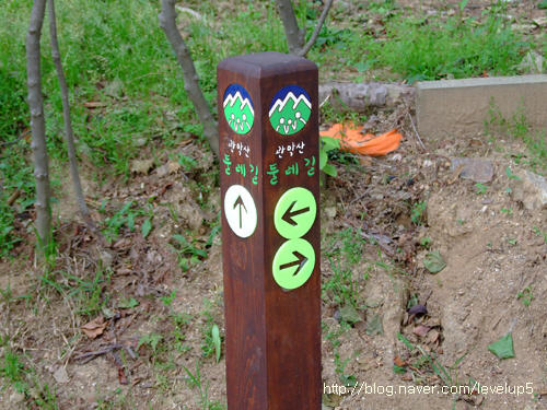 방향 표시목 - 횡단보도, 공원등에서 어느방향으로 둘레길이 진행되는 지 알려준다. 아! 가끔 저 동그란 화살표를 뜯어간(?) 것도 있으니 주의를 요한다.