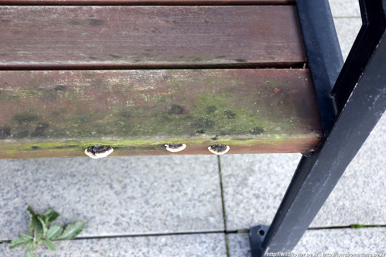 하나로마트 앞에 벤치에서 잠시 쉬는 데, 벤치에 자리잡은 구름버섯.
