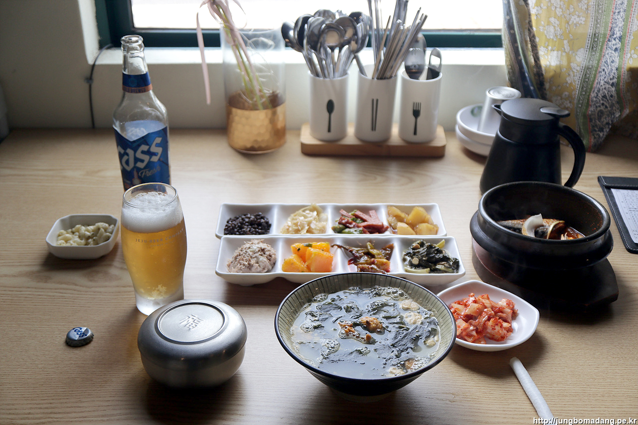 혼자 왔다고 1인 자리 안내해 주시는 데, 창문도 있고 좋네요. 맥주 한병 추가로 시키는 데 안주도 챙겨주시는 센스.