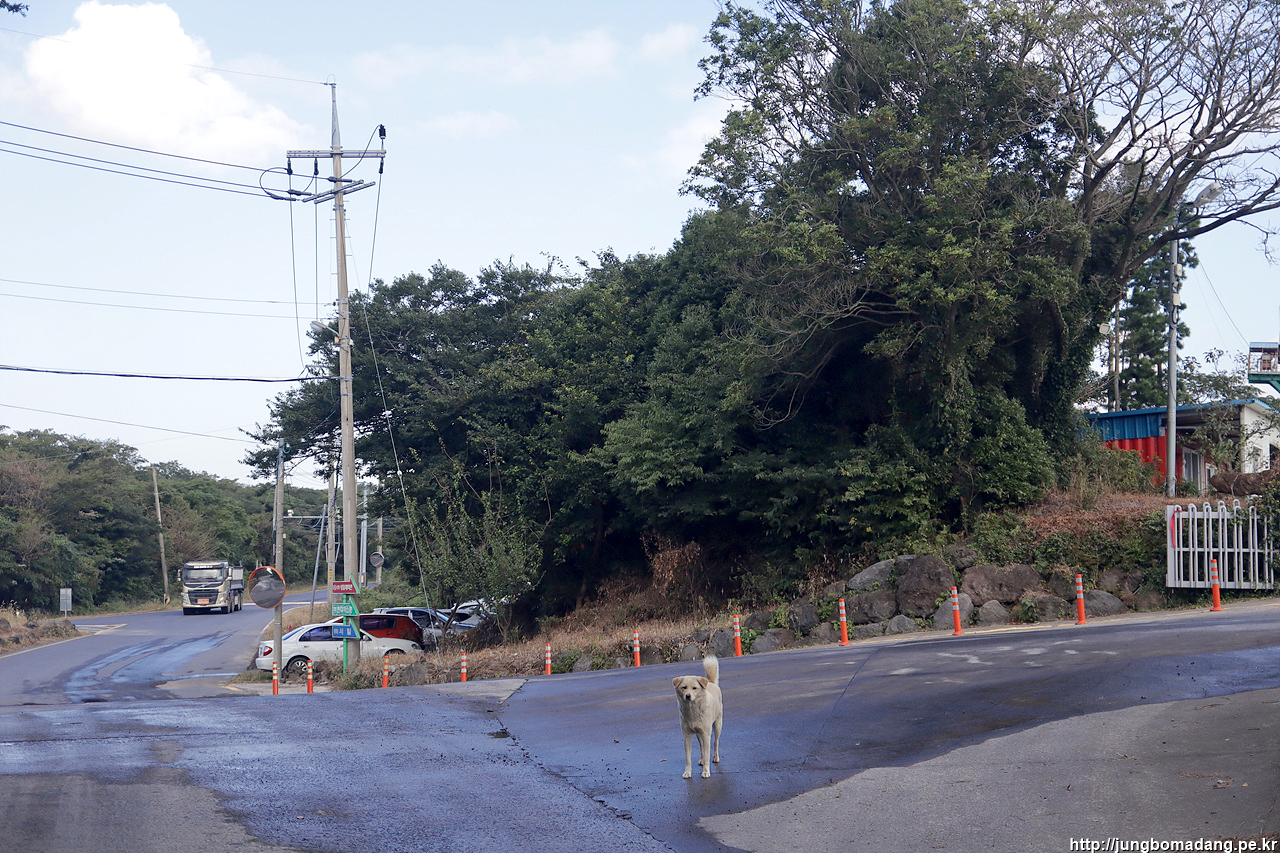 소랑못에서 화순곶자왈생태탐방로를 가는 길에 논오름을 들려보려고 가는 길. 공장에서 순한 댕댕이 한마리가 수상한 자를 수색하러 나옵니다. 활동 영역이 정해져 있는 지 더 이상 다가오지는 않습니다.