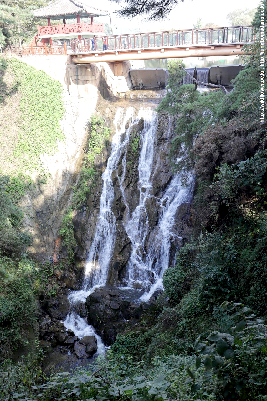 용추폭포 위로 조성된 유리다리에 반사되어 호수에 무지개 빛으로 비추네요.