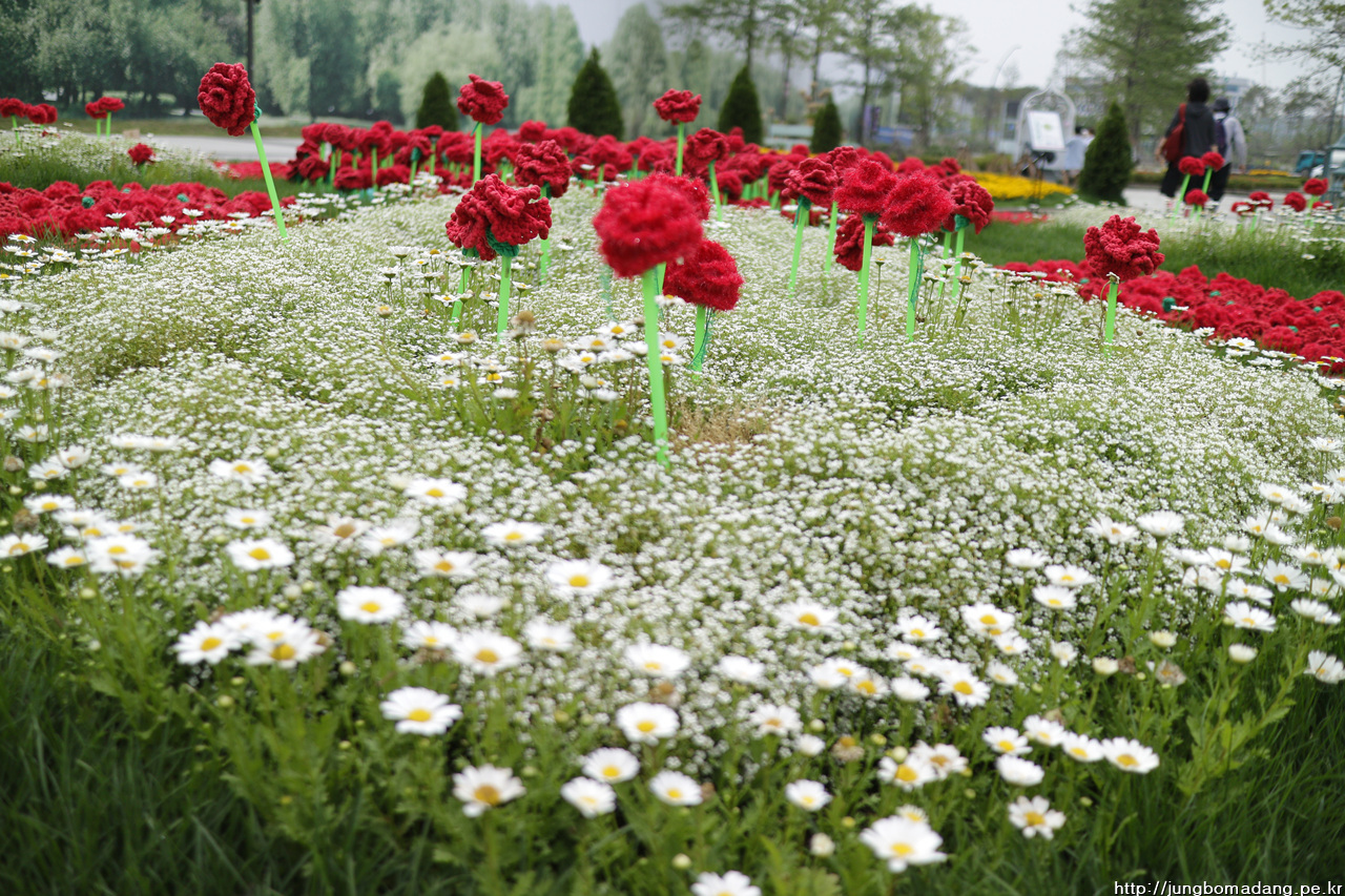 손으로 만든 빨간 장미 아래로 하얀 안개꽃과 마가렛