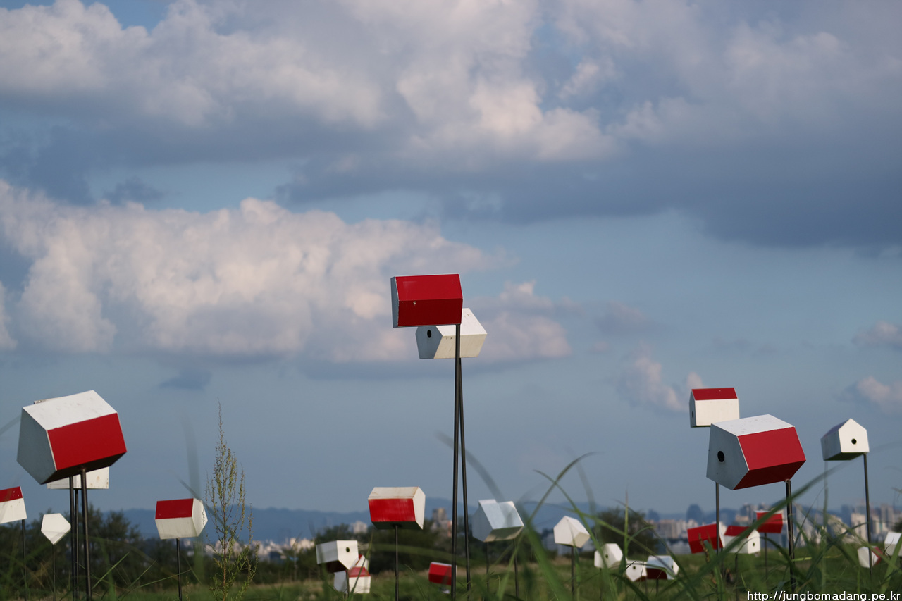 새는 들어가기 힘든 사이즈의 구녕을 마구 뚫어둔 전시용 새집입니다. - 이러다 안에 진짜 새 있으면 어쩔껴?