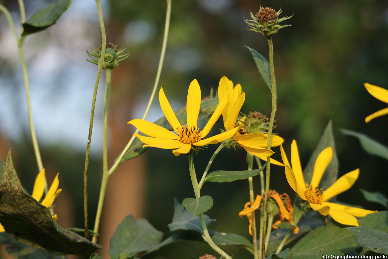 뚱딴지(돼지감자) - 뚱딴지가 머여? 뚱뚱한 사람이 딴지 거는 거여? 그건아니구요.돼지감자는 옛날엔 돼지나 먹던 감자라고 그리 칭하고, 생뚱맞게 여기 저기 돋아나서 밭을 망친다고 해서 뚱딴지라는 별명을 얻었다고 전해 내려옵니다. 꽃은 이러하지만, 뿌리쪽에 식용 가능한 열매(돼지감자)가 나오죠.