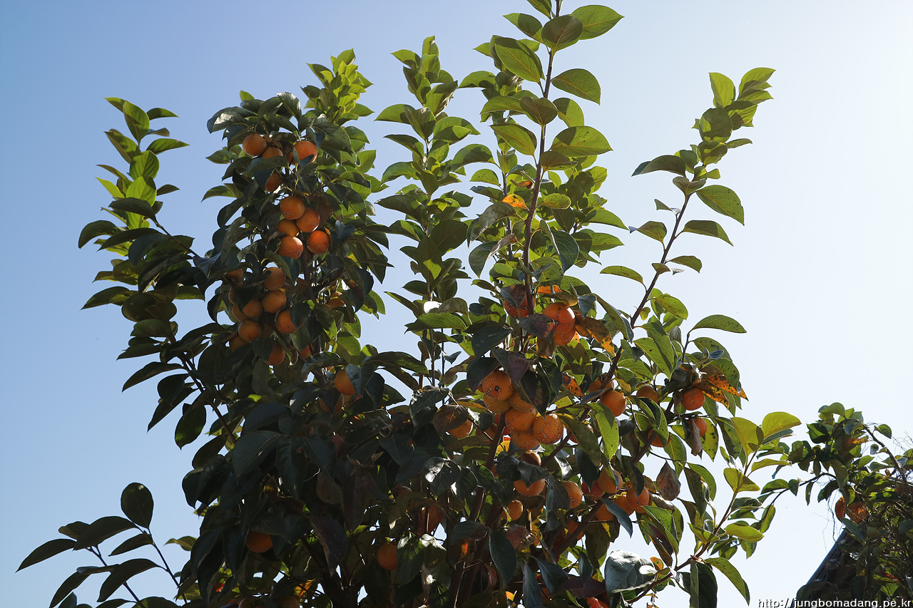 담장 위의 감나무에 홍시가 먹음직 하네요.