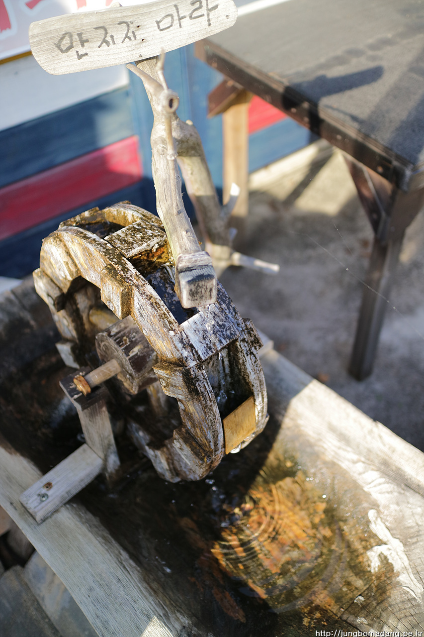 만지지마라 - 어느 가게 앞에 작은 물레방아에 적힌 결의가 느껴지는 말