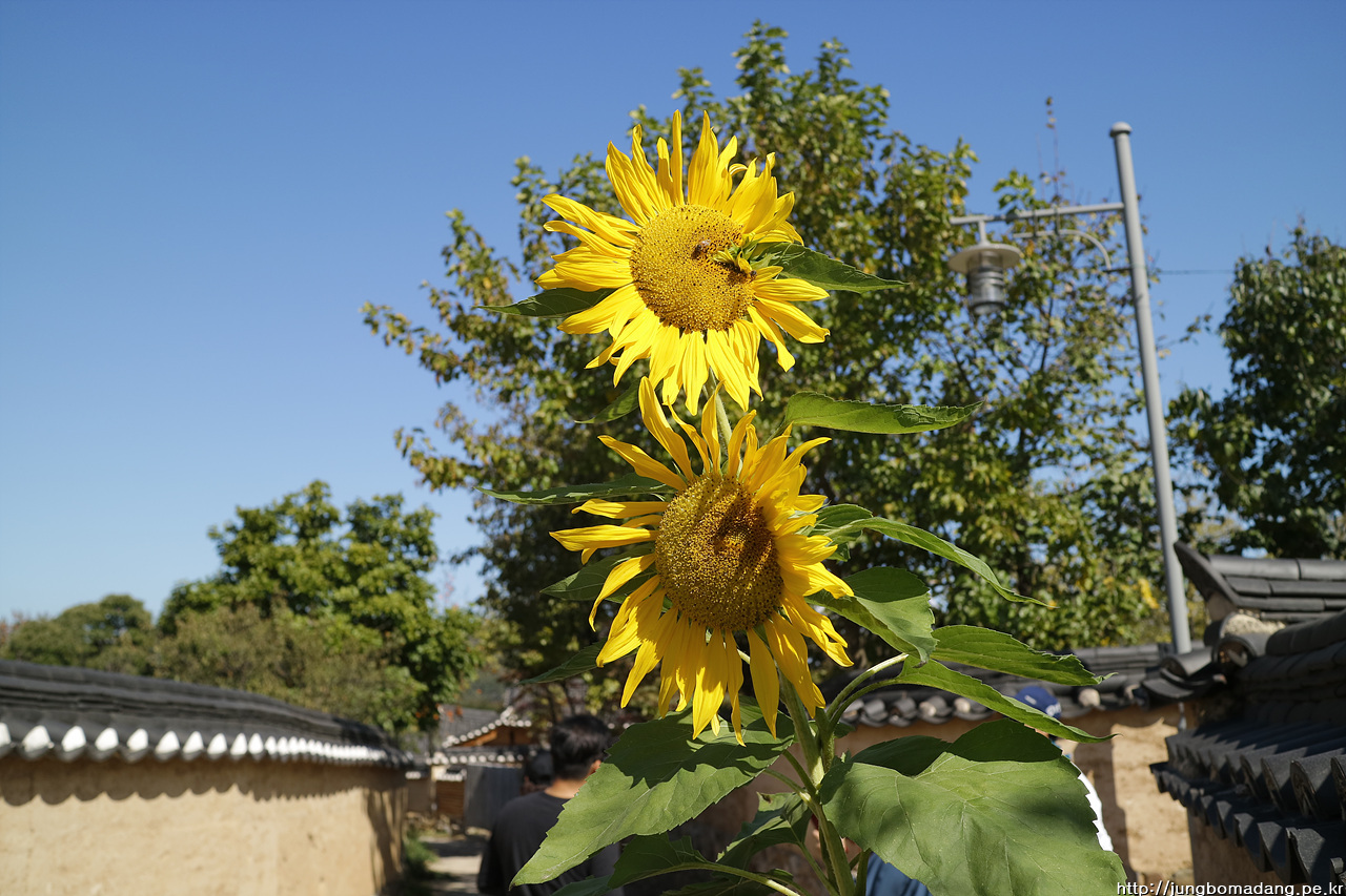 해바라기가 담장에 고개를 떨구고 있네요. 그러게 술은 적당히 마셔야...