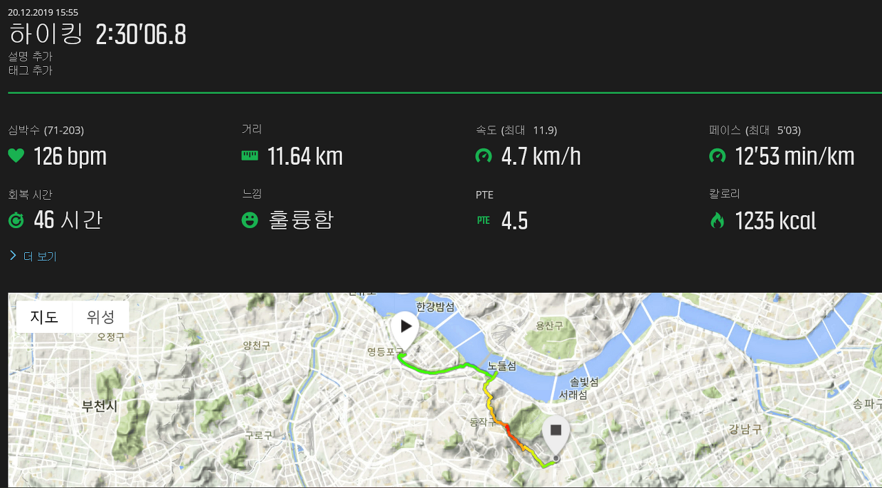 여의도 전경련회관부터 동작충효길 1코스,2코스 일부를 경유해서 1235Kcal를 불태우고
