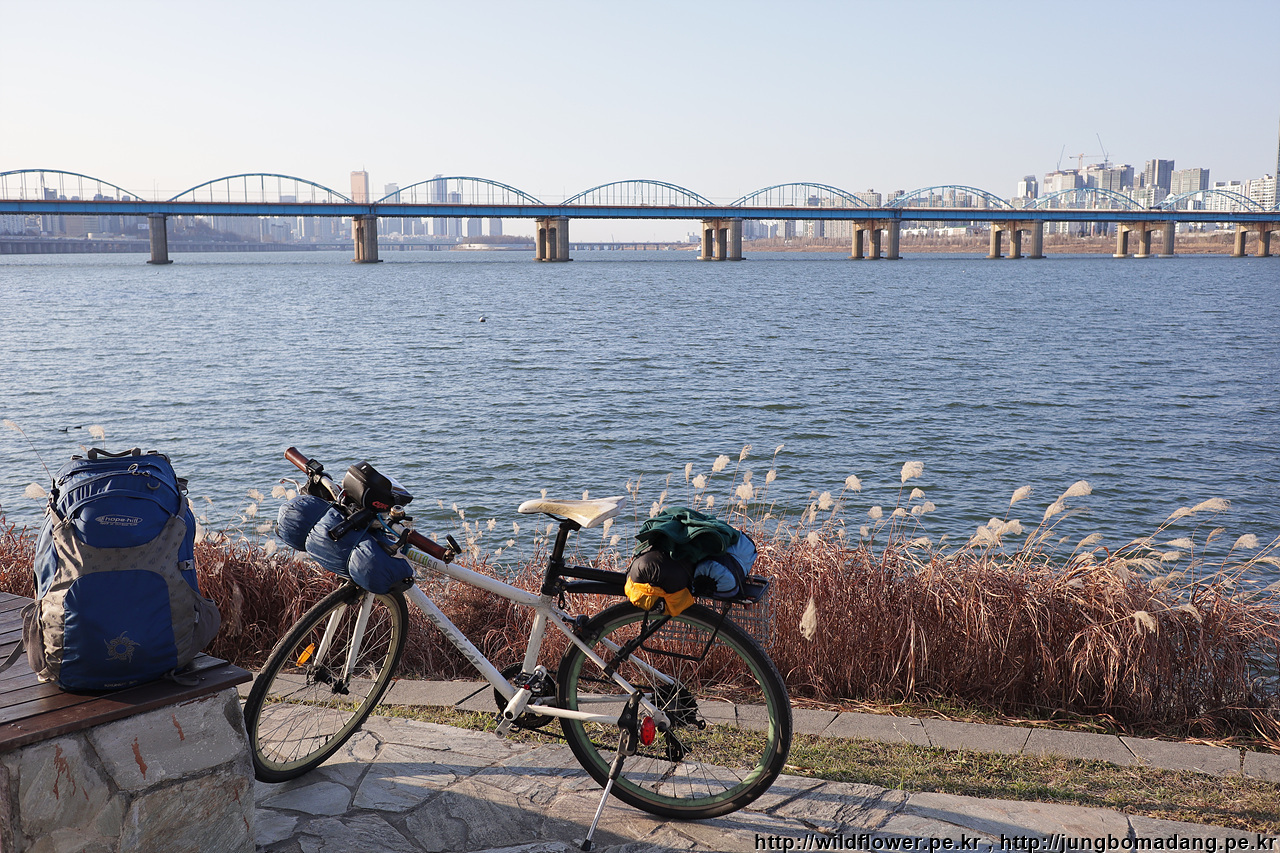 그렇게 자전거 짐을 꾸려 반포를 지나고 있습니다. 자전거 앞에는 텐트, 뒷쪽 짐칸에는 침낭, 그외 짐들은 32리터 배낭에 넣고 이동 중입니다.