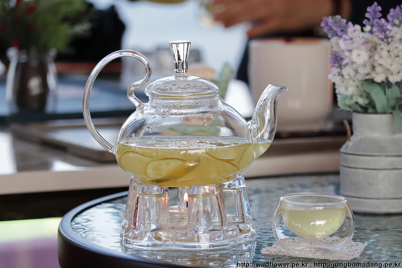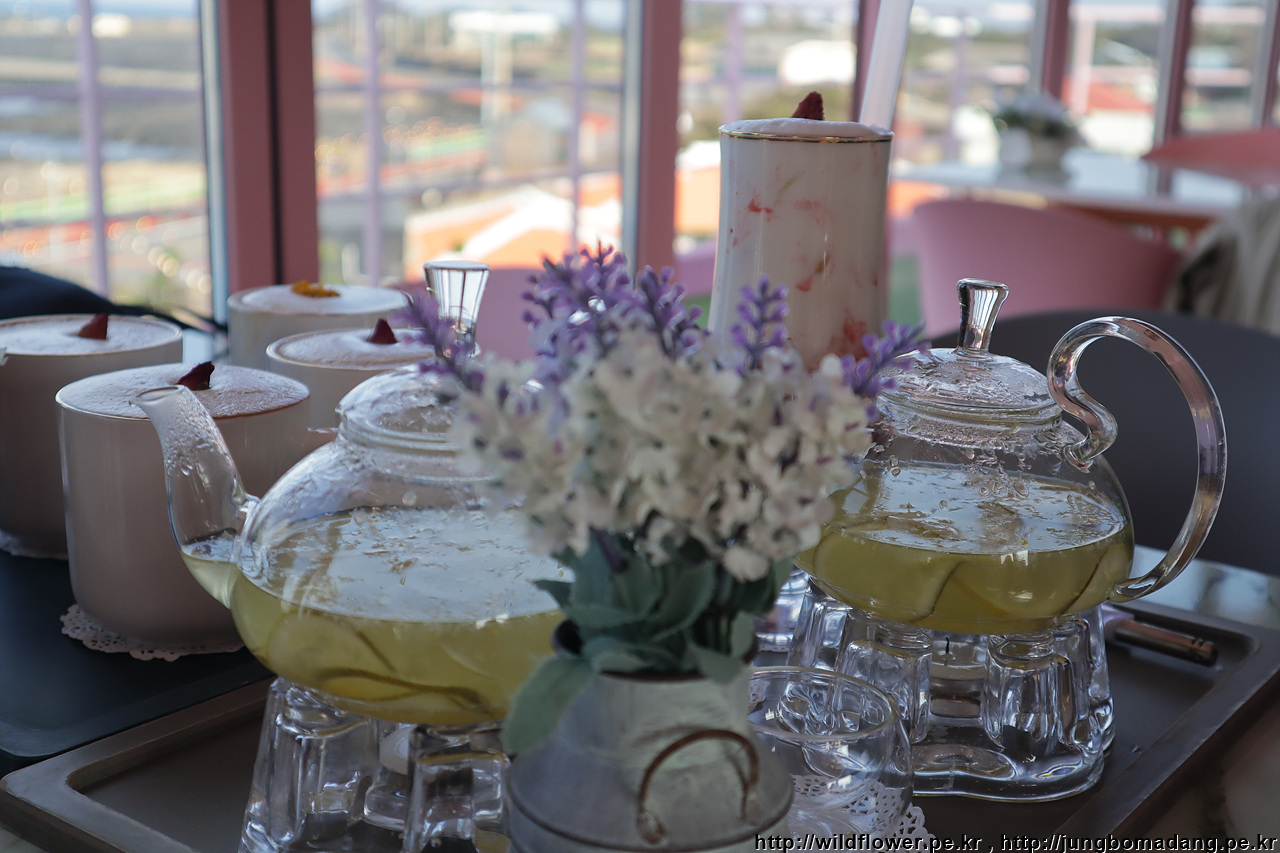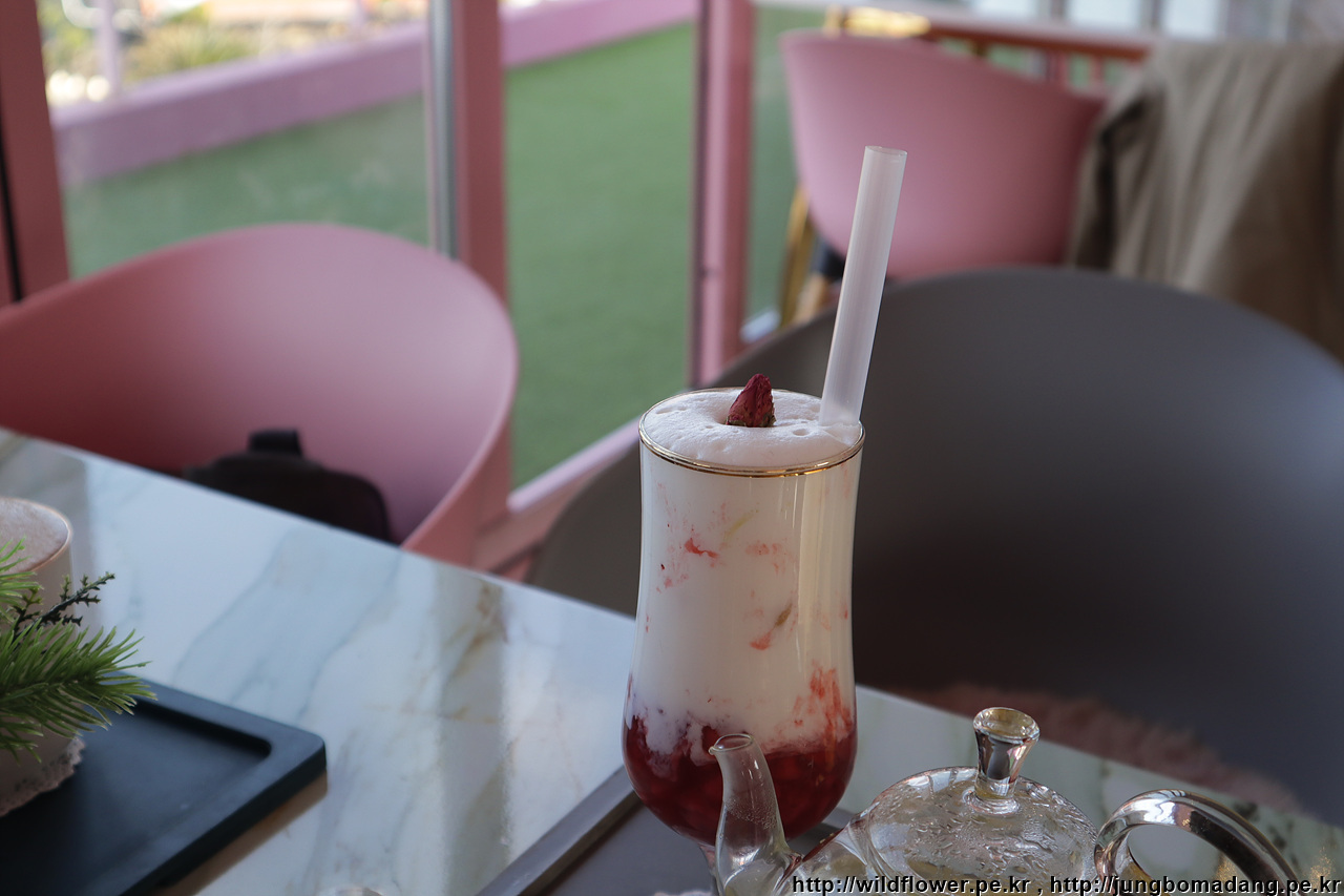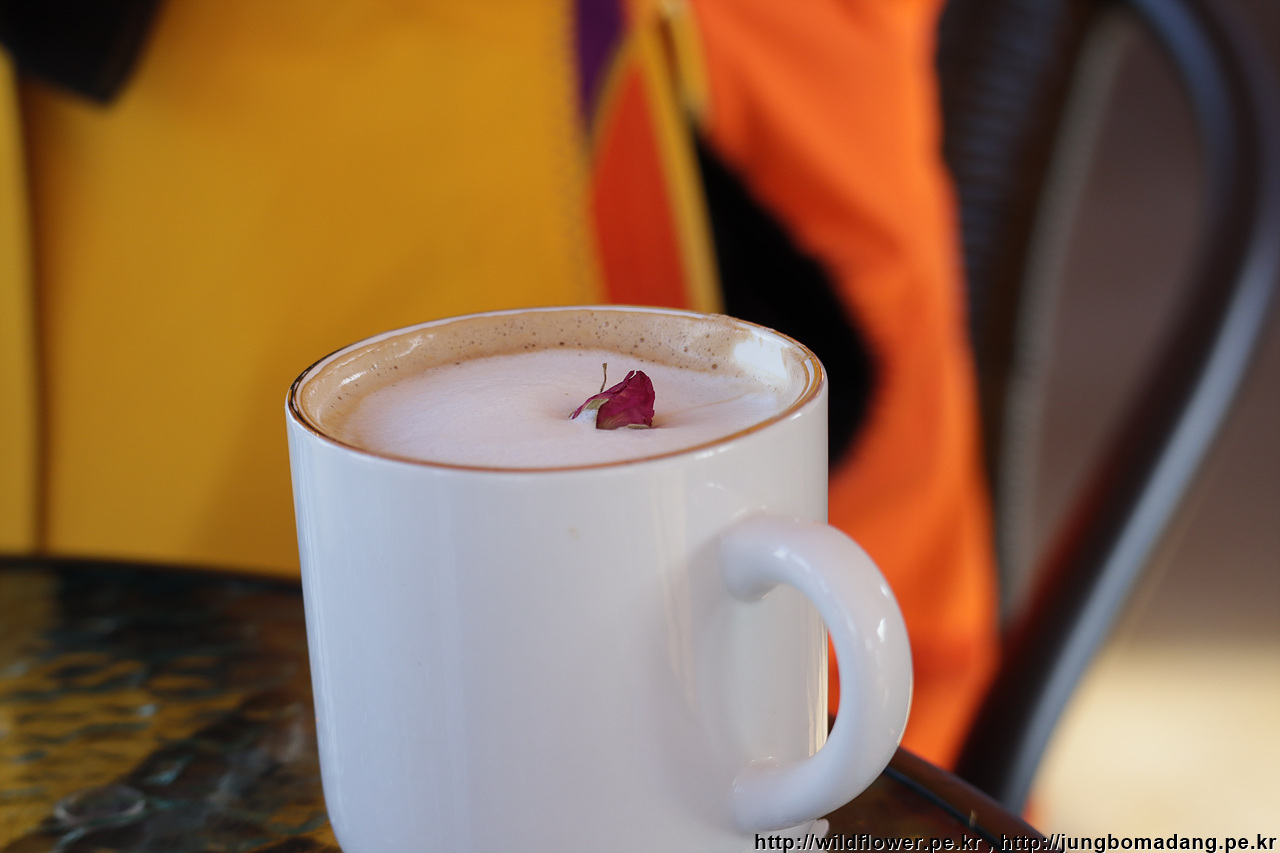 드디어 주문한 커피 등장, 주문에 맞게 말린 꽃들이 얹어 나옵니다.