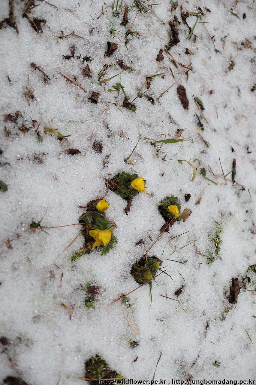 아직 꽃을 완전히 티우지 않은 복수초가 눈에 띕니다.