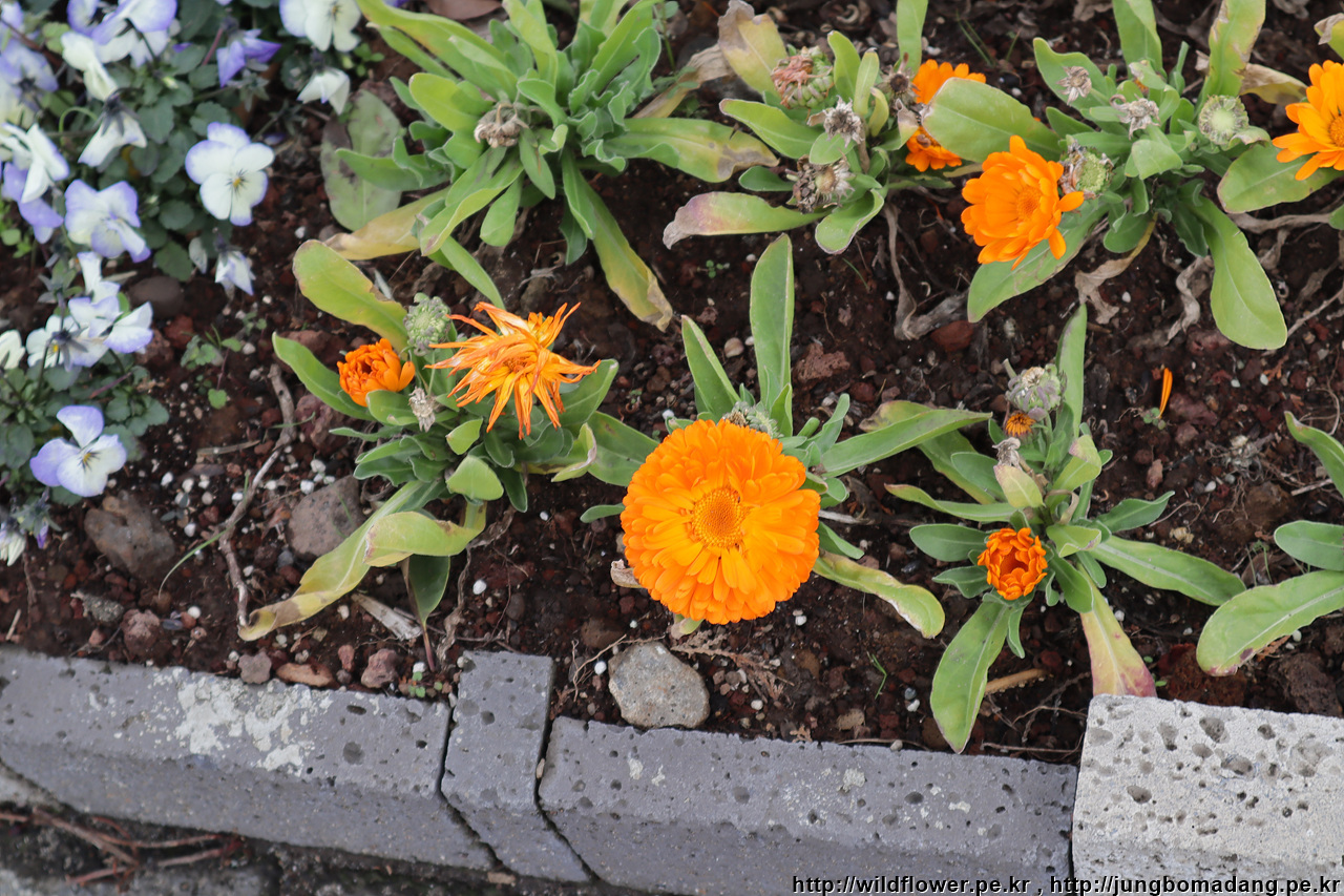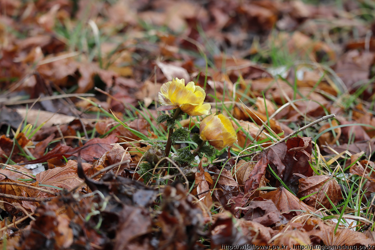 아직 꽃을 완전히 티우지 않은 복수초가 눈에 띕니다.