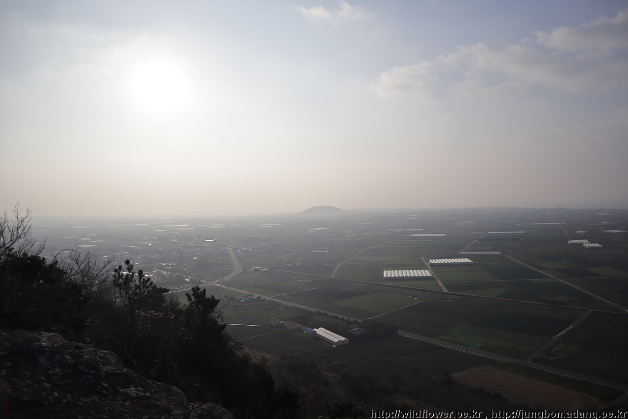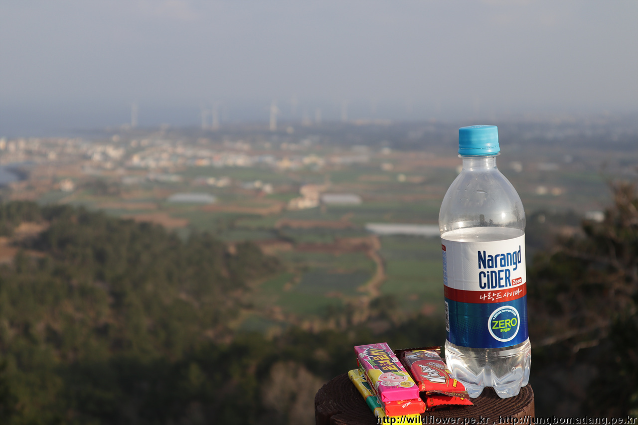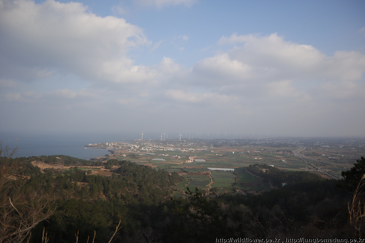 광이오름 정상 도착, 제주 시내와 바닷가도 보이고