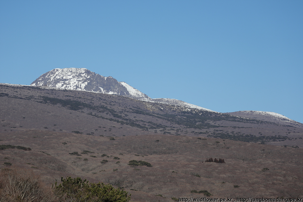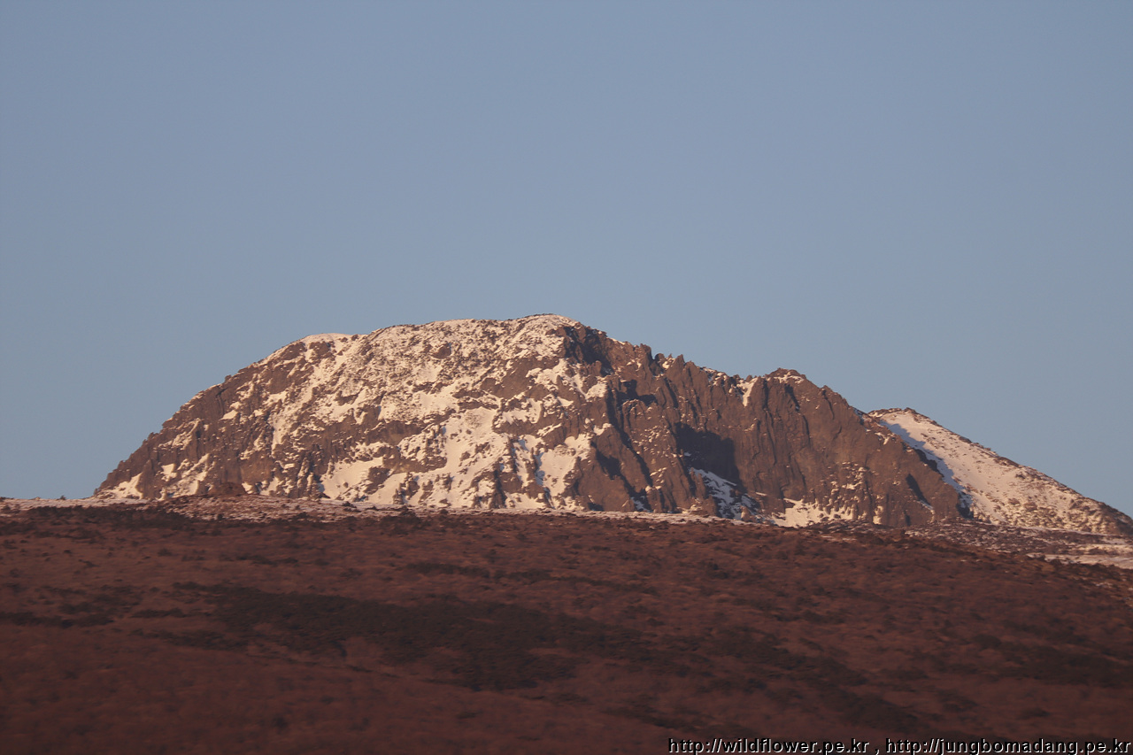 잘 보이진 않지만, 한라산 중산간부터 정상부 근처까지 하얀 상고대가 뒤덮여 있습니다.