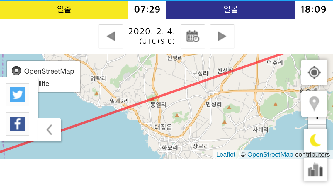 현위치 기준으로 직선의 왼편은 일몰, 오른편은 일출 방향을 의미합니다.