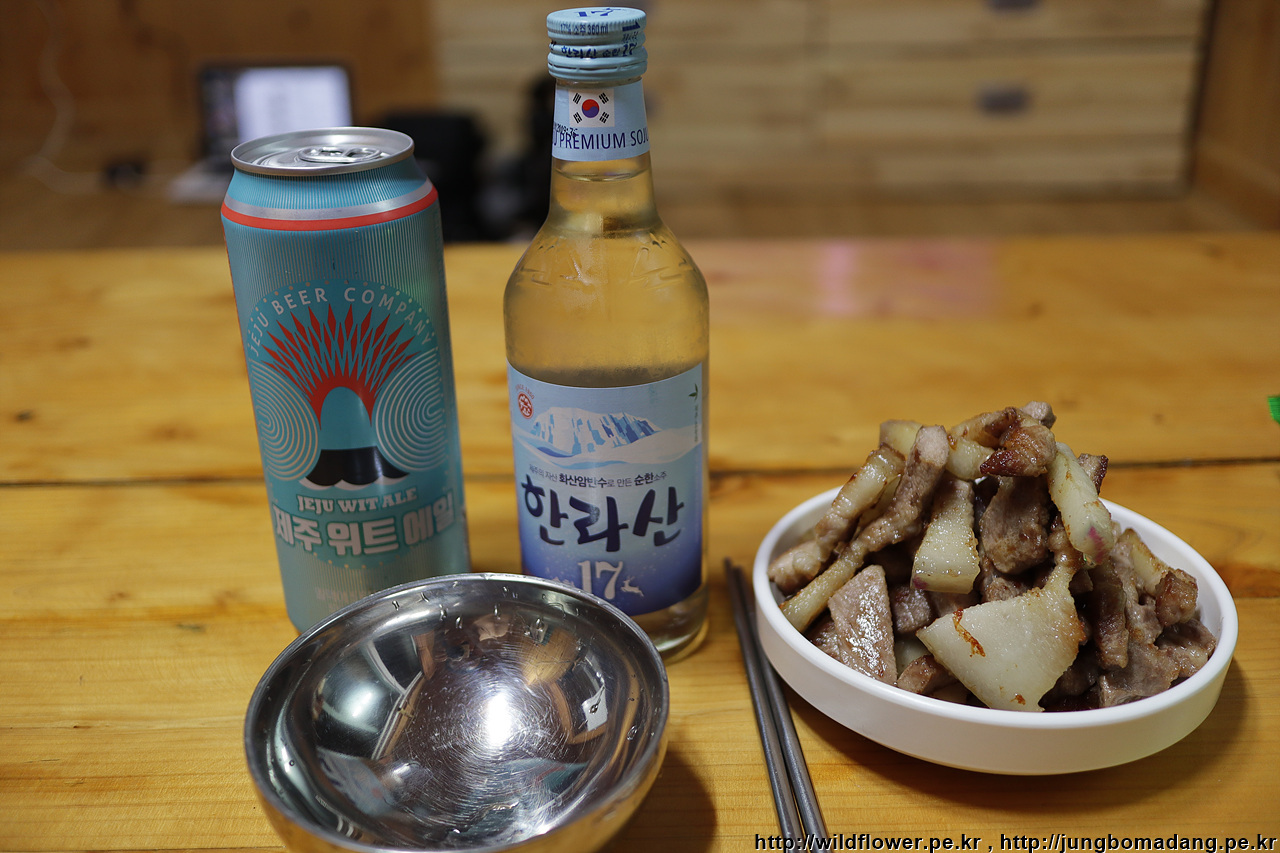 그리고 가볍게 한잔? 술은 제주산 소맥(제주 위트에일맥주+한라산 소주), 안주는 돼지고기 목살입니다.