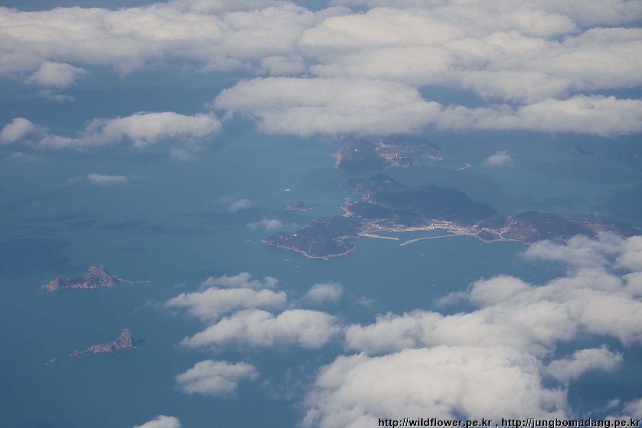좌측으로 넓적한 것은 가파도, 그 우측에 송악산, 가파도와 송악산 아래 두개의 작은 섬은 형제섬, 우측에 큰 봉우리는 산방산입니다.