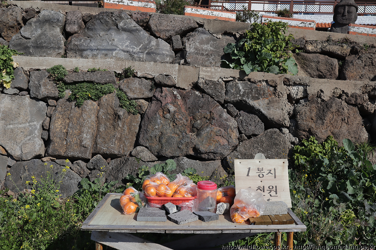 얼핏 보면 제삿상 분위기의 무인 판매대. 귤은 이틀동안 지겹도록 맛봐서 그냥 지나칩니다.