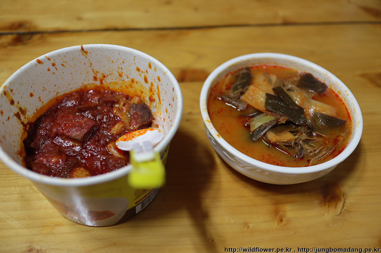 숙소에 도착해서 저녁 식사로 제육덮밥과 육개장