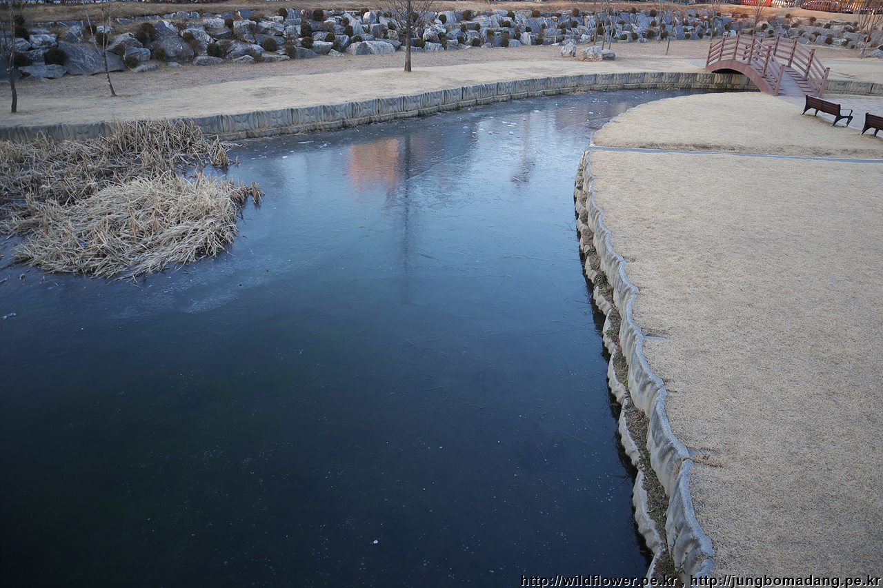 코가 시린 날 인공 호수는 얼어서 추위를 증명합니다.