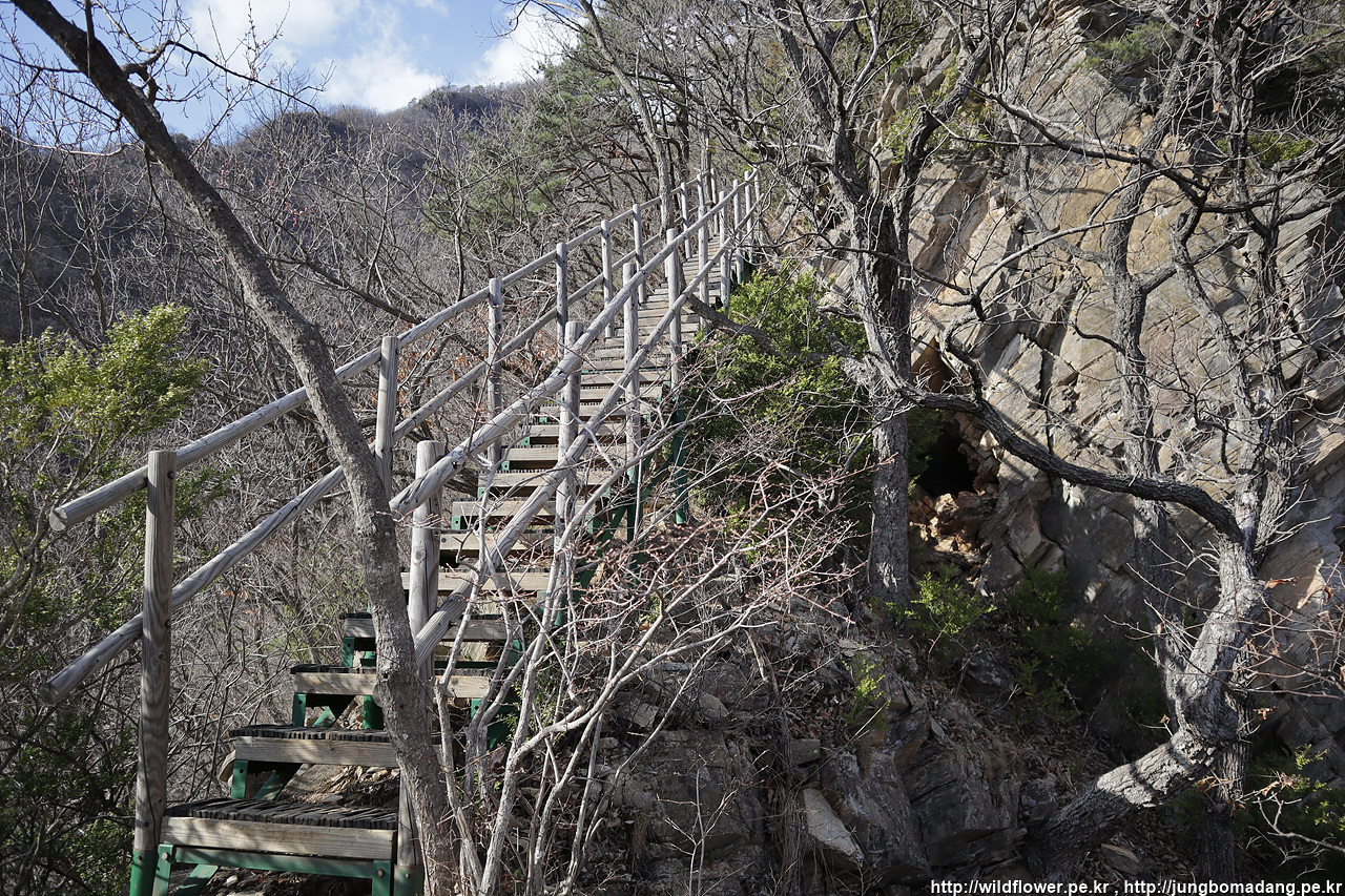 계단. 나무를 밟으면 미끄러울 수 있으니 조심해서 하산을