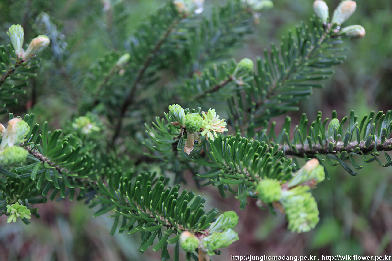 구상나무의 끝에 꽃인 줄 알았던 것은 뭉쳐진 잎 형태로 점점 펼쳐지며 잎으로 변해가는 모습을 발견할 수 있었습니다.