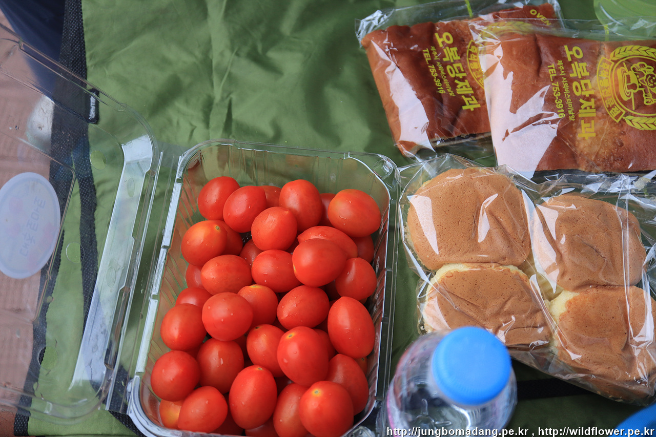 9시 정각 - 속밭대피소에서 간식 타임. 새벽에 서둘기도 바쁘셨을 텐데 빵도 챙겨 오셨네요. 방울토마토는 어제 제가 마트에서 사다가 씻어온 것입니다.