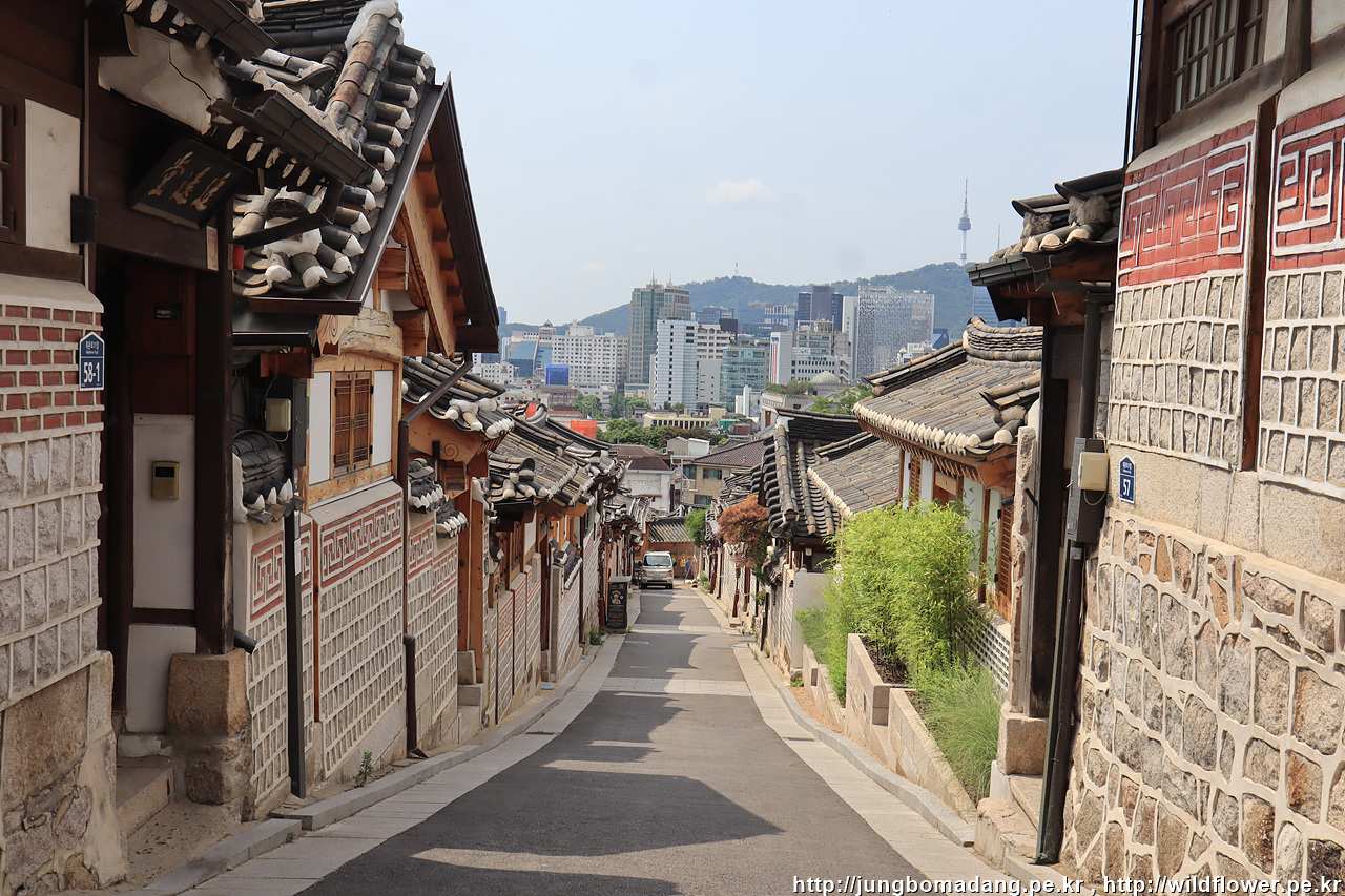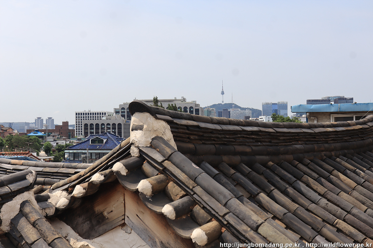 북촌 6경 : 가회동 골목길 (오름). 한옥 지붕 사이로 펼쳐지는 서울의 전경. 처마 끝 사이로 보이는 서울 시내 전경이 북촌 산책의 백미. 저도 백미 좋아함.
