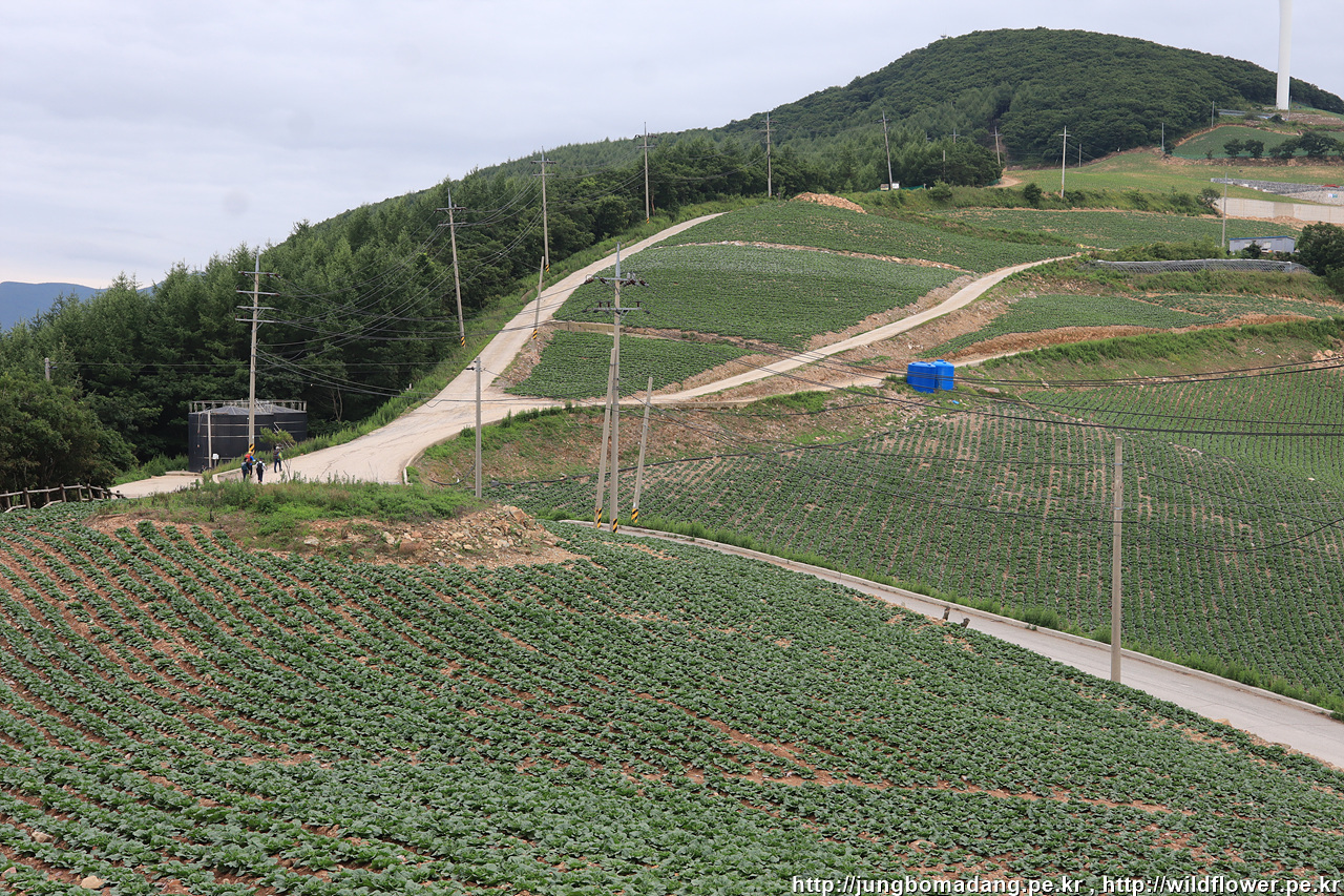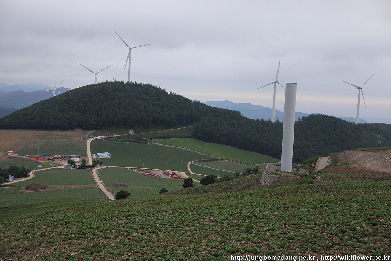 고랭지 배추받에 선풍기들이 눈에 들어 옵니다. 열심히 전기를 생산 중이겠죠.