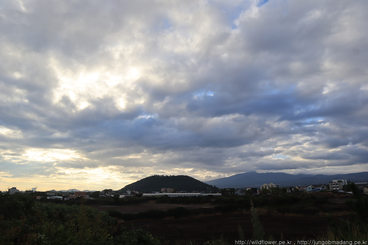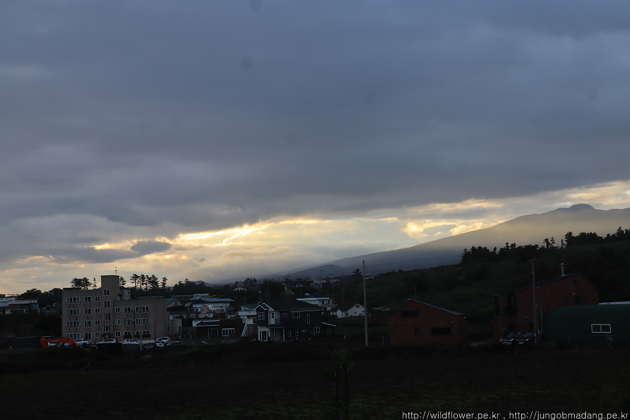 펜션 뒤로 잿빛 구름 사이로 빛이 한라산을 비추고 있네요.