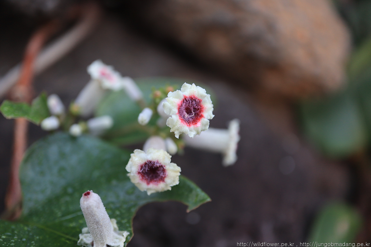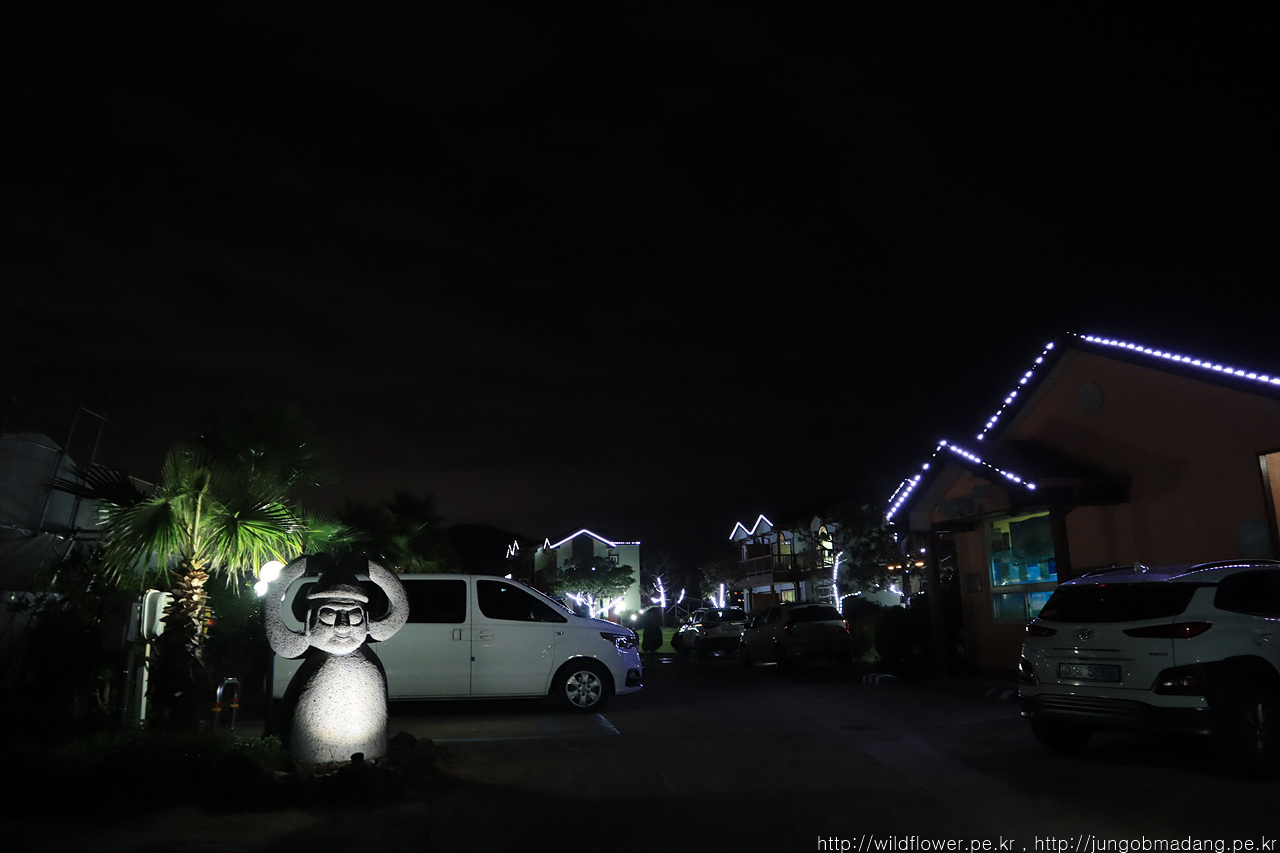 어서와 하트 뿅뽕 돌하루방은 처음이지? - 공항에서 20분 거리에 있는 명주주택 정류장에서 202번 버스를 타고 30분 정도 후에 중엄리 버스 절류장에 하차. 걸어서 홀로 펜션에 입장. 그런데 입구에 불 켜진 돌하루방이 웬지 으스스합니다. ㅋㅋㅋ