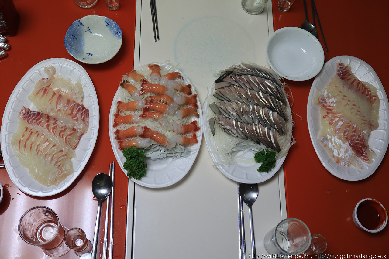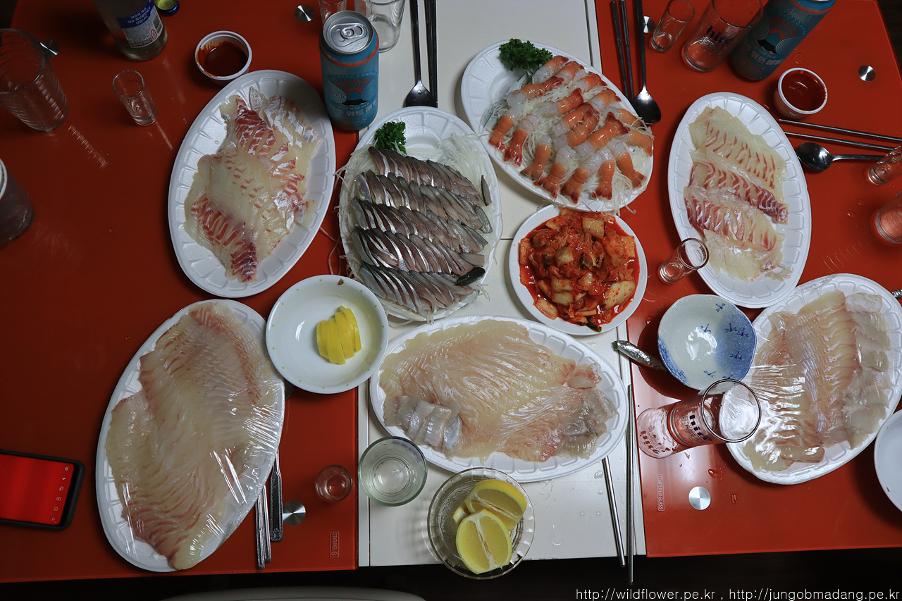 동문시장에서 회를 뜨고, 마트를 털어서 숙소에서 잠시 판을 벌려봅니다.