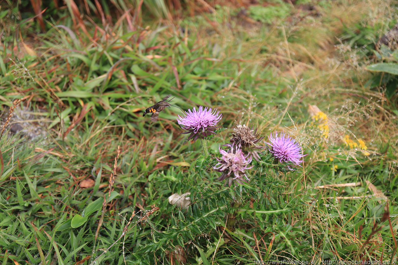 엉겅퀴에서 작업중인 박각시나방(좌)