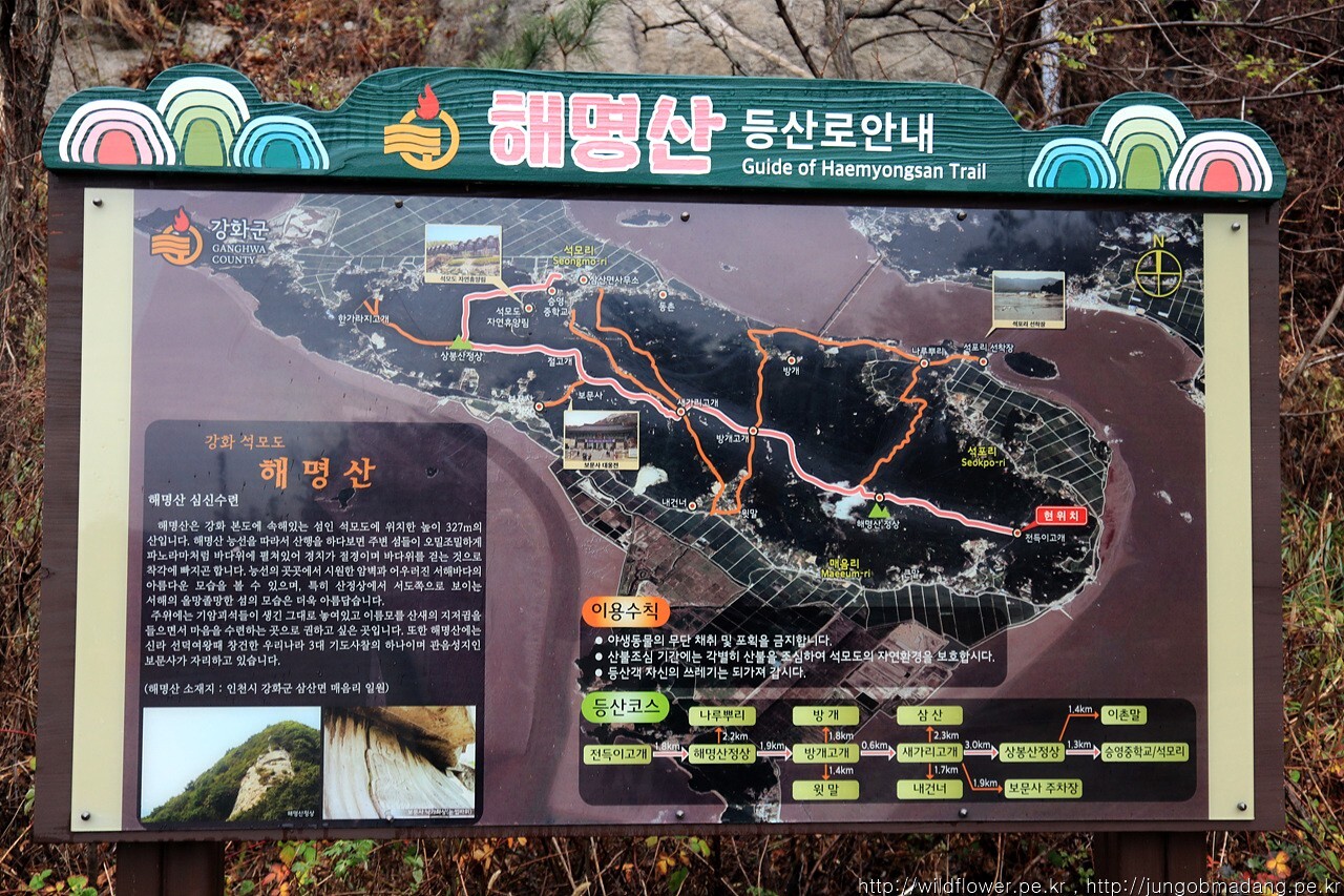 이정표에 맺힌 빗방울이 해명산이 이쪽이라고 해명중입니다. 석모도 도착 전까지 전득하니 내리던 비는 다행히 산행 출발 전 그칩니다. 행운은 이정도만 해도 행복합니다.