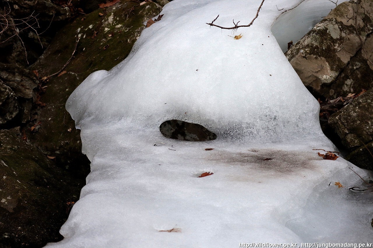 하산길에 마주한 빙산이 아니고 잔설 얼음