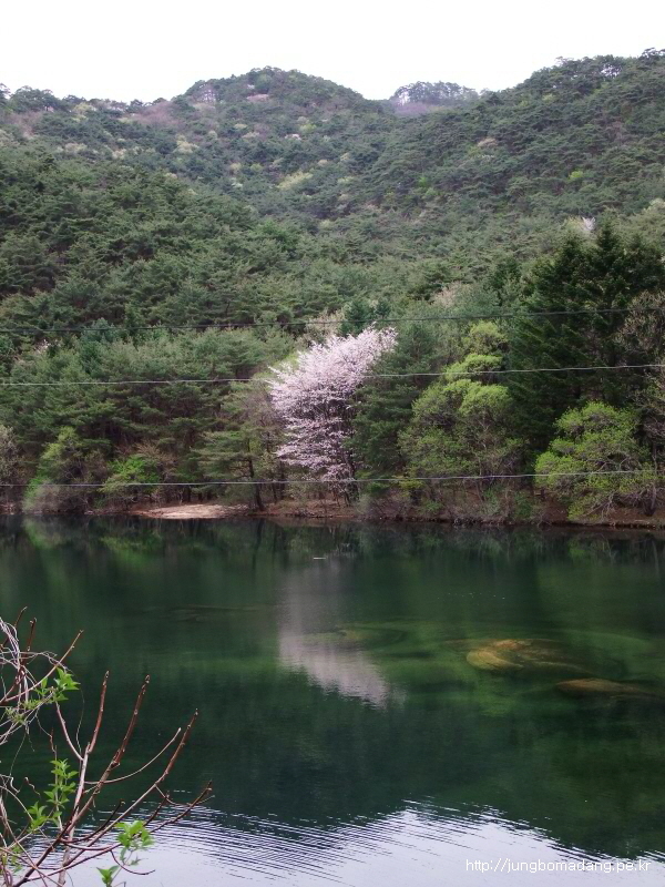 물에 비추인 벚꽃의 반영과 초록빛 물 아래 바위가 마치 잘 그려놓은 풍경화처럼 느껴진다.