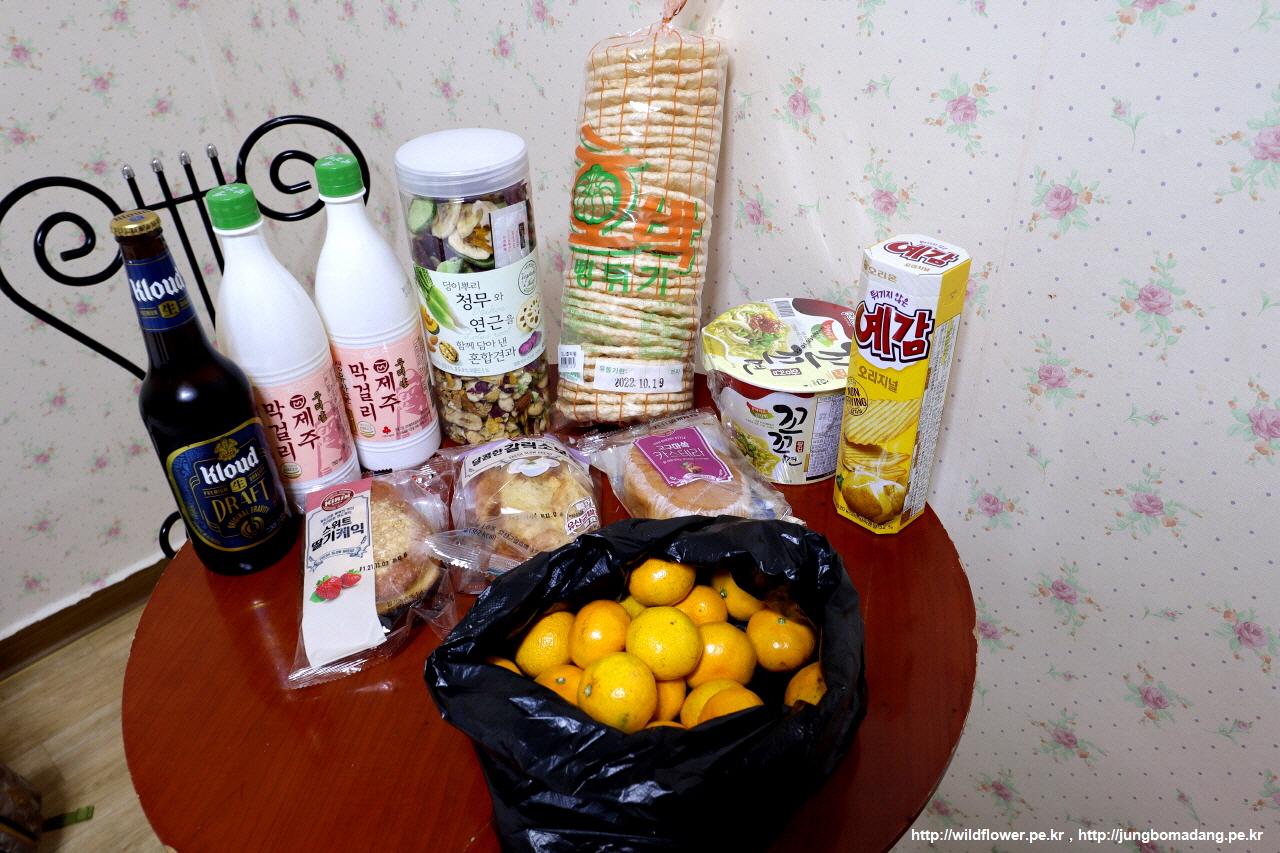 위생 상태는 별로지만 어차피 하루 묵는 것이고, 천천히 쌀국수 2개로 저녁을 해결하고, 남은 귤과 과자를 안주삼아 제주 위트에일 맥주 2캔과 제주막걸리 2병을 천천히 밀어 넣고 1박합니다.