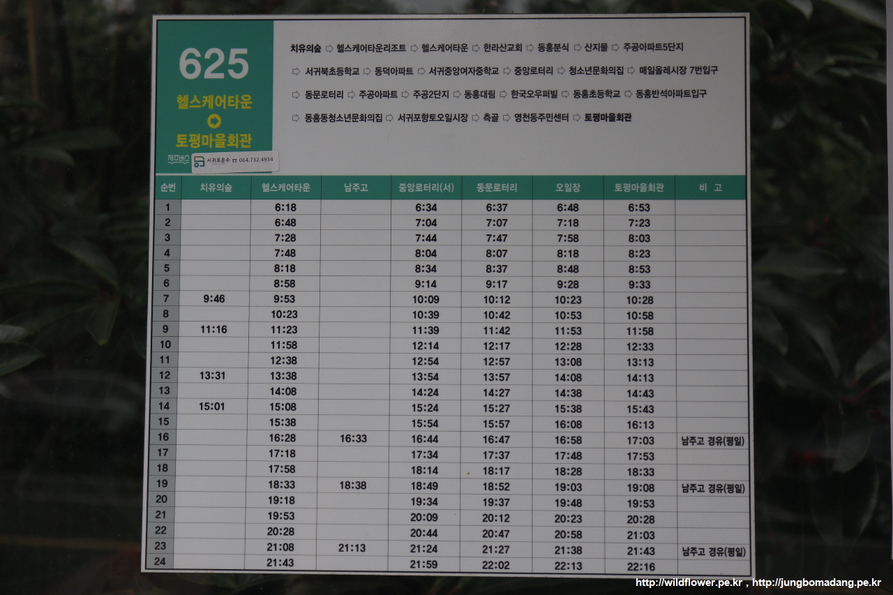 오늘은 어제처럼 야물딱지게 계획 안잡은 통에 일단 안가본 곳 중에 서귀포 치유의 숲으로 발길을 향해 봅니다. 중앙로터리에서 625번 버스를 타고 이동합니다. 하루 몇 대 없으니 시간 잘 보고 가야합니다. 진짜 대중고통이 되지 않으려면요.