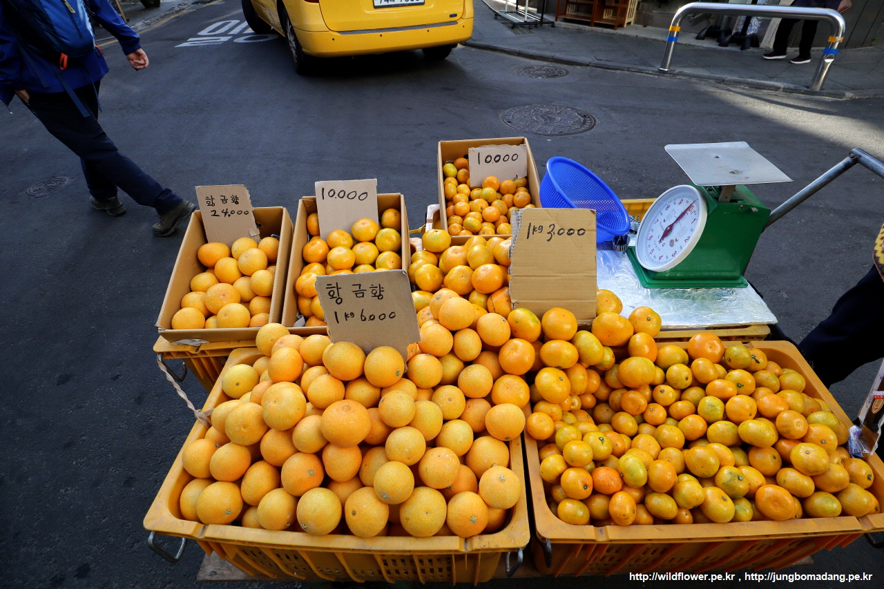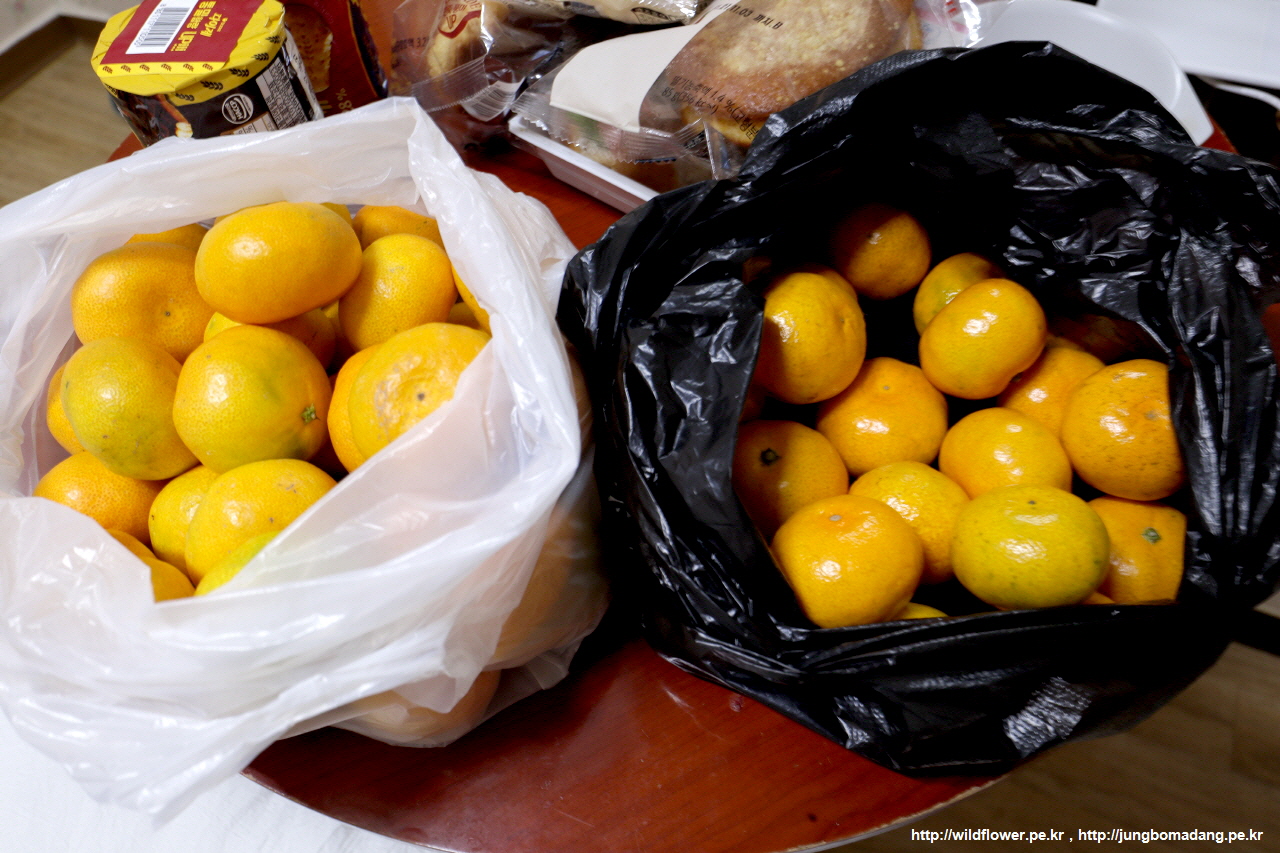 제가 잘 던져 놓은 귤이 그새 바람나서 귤을 생산했나요? 그건 아니고 일몰 보러 가는 길에 늘 그자리에서 귤과 한라봉 파는 할머님에게 귤 오천원어치 샀습니다. 흰봉지는 오천원(노상), 검은봉지는 삼천원(서귀포매일올레시장). 시장에서는 저울에 달아서 계량해 주던데, 할머님은 대충 개수 세아려서 주던데, 암튼 그렇습니다 ㅋㅋ