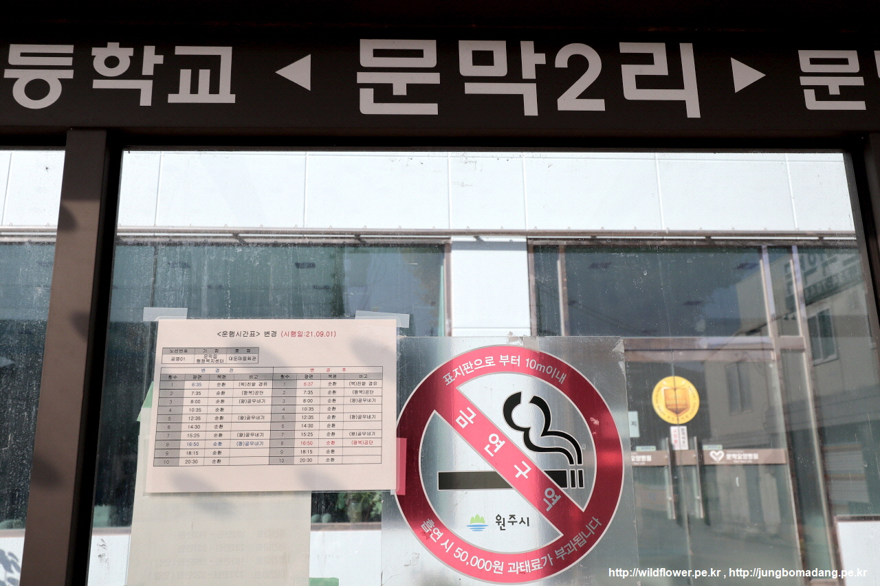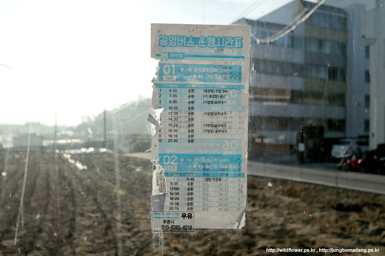 처음에 궁금했던 반계리 은행나무 가는 버스(1번, 2번) 시간표입니다. 문막2리 정류장에 붙어 있습니다. 문막정류소에서 여기까지 2km를 걷거나 51번 버스 타고 와서 환승해야 합니다.