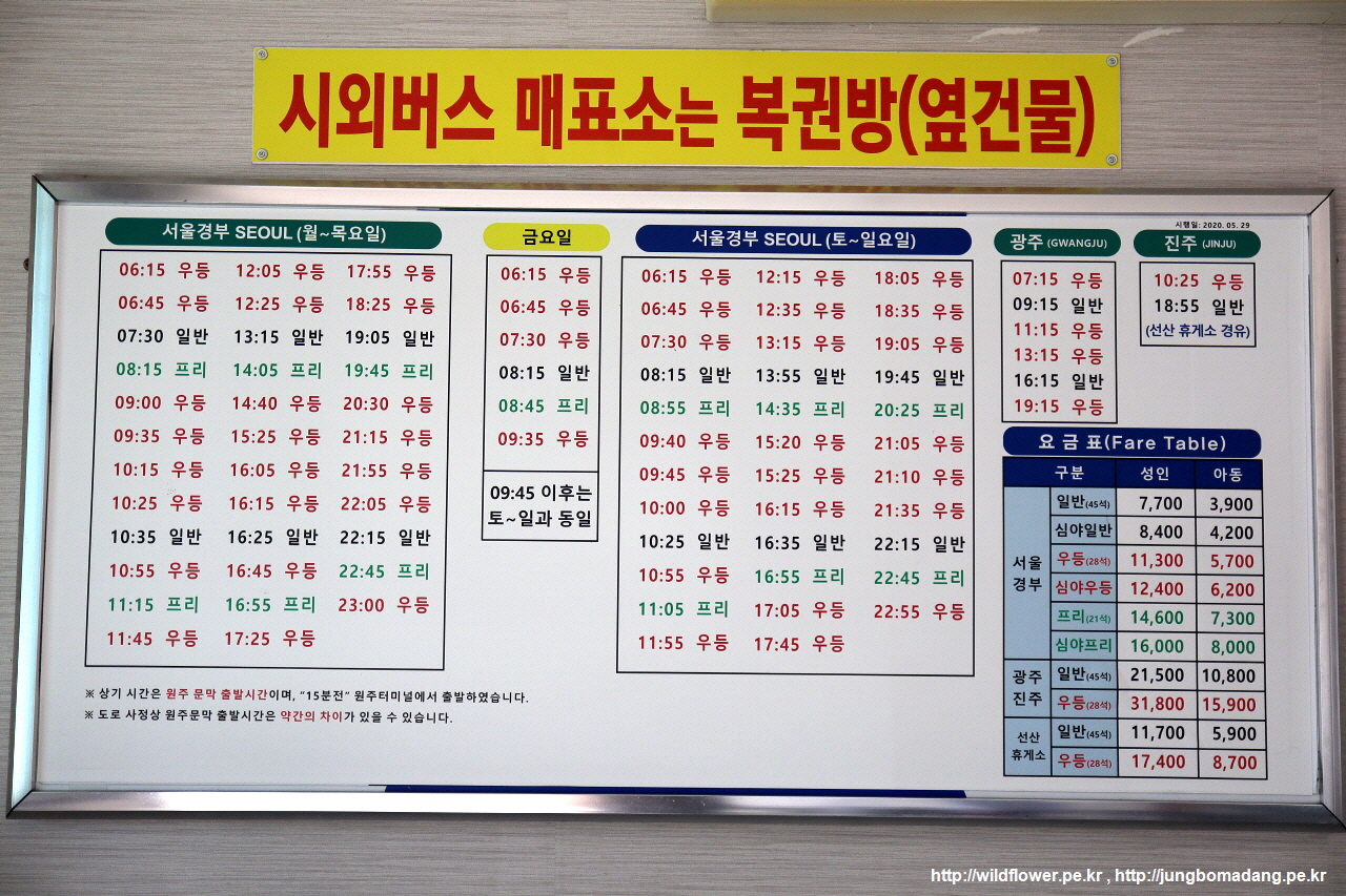 여러 교통수단 중에 고속터미널에서 문막을 경유해서 원주로 가는 버스를 이용하기로 합니다.
